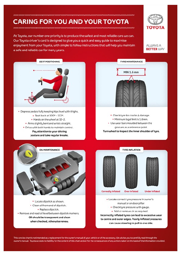The same can be said of your Toyota. Manufactured with the utmost care and attention and to the strictest standards, you will need to spend some time and effort to maximise your enjoyment, comfort and safety.